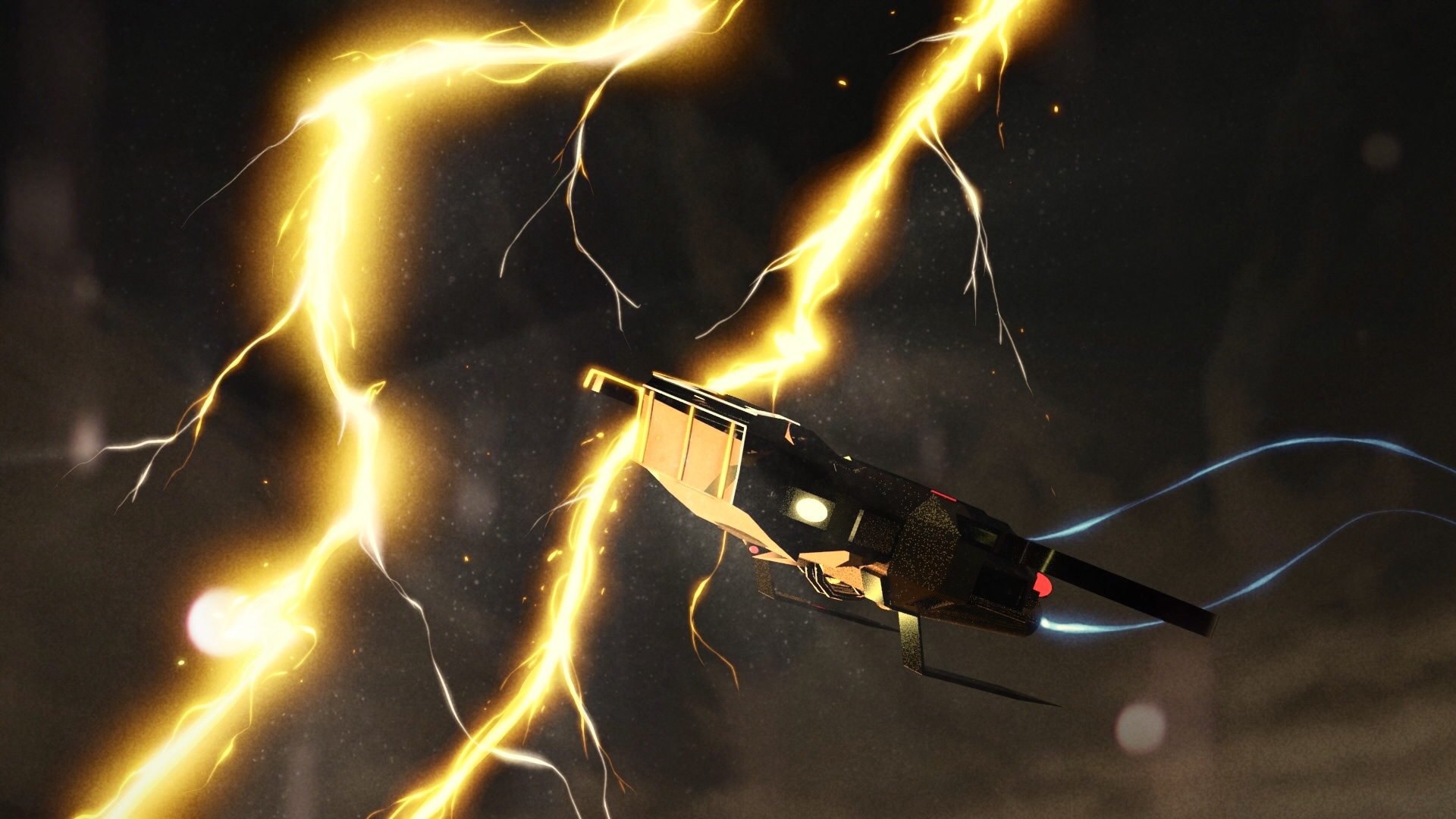The hummingbird soars through the lightning and tendrils of medusa. Hummingbird is one of the six shuttles onboard the mothership. The protagonist flies through the turbulent skies of the planet, avoiding its energy beams.